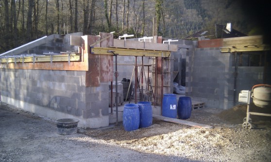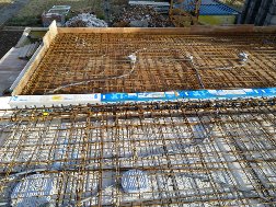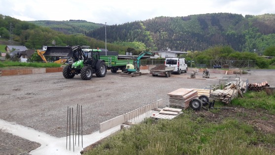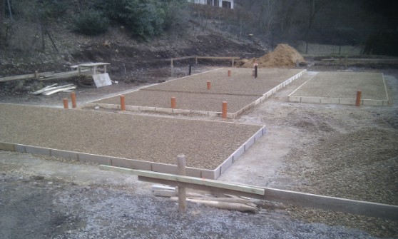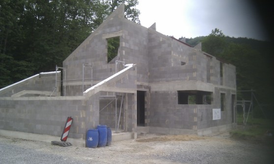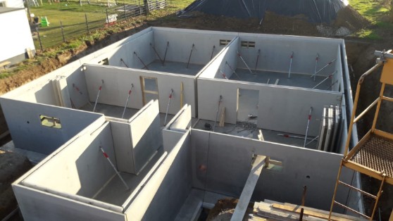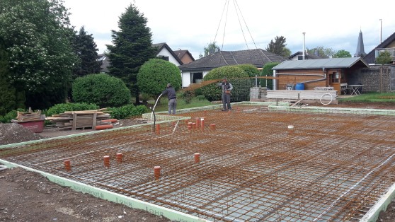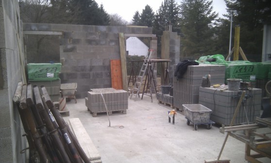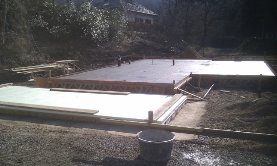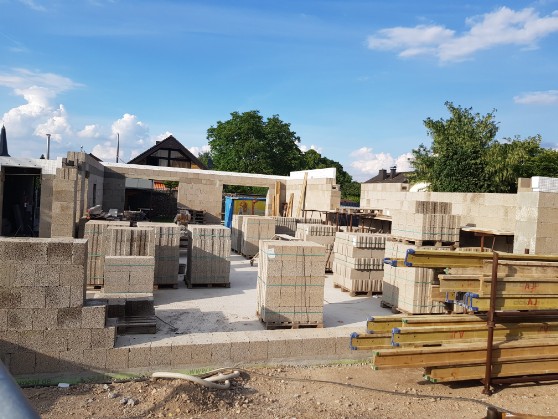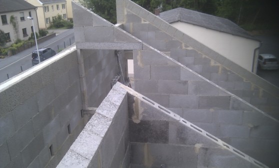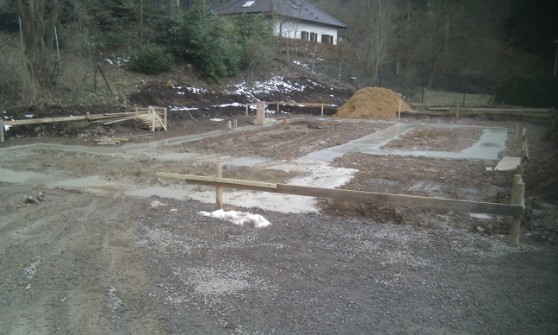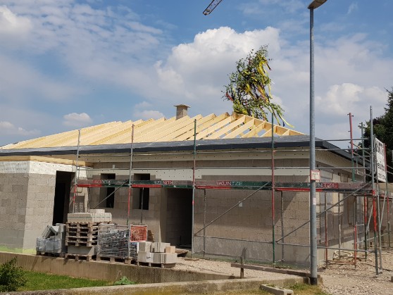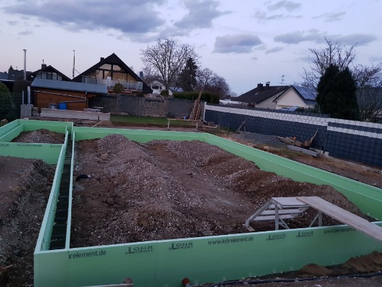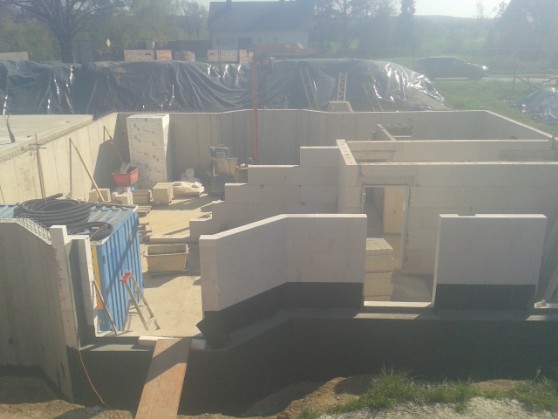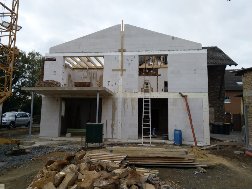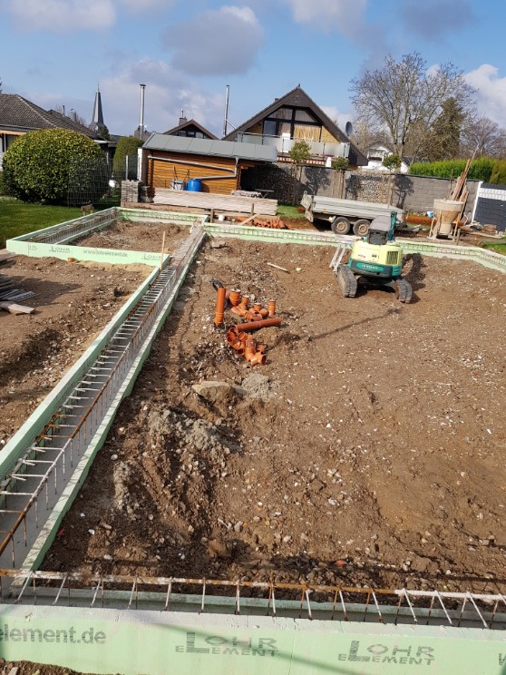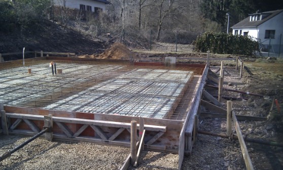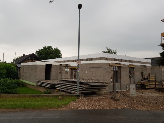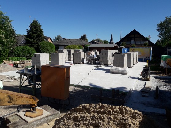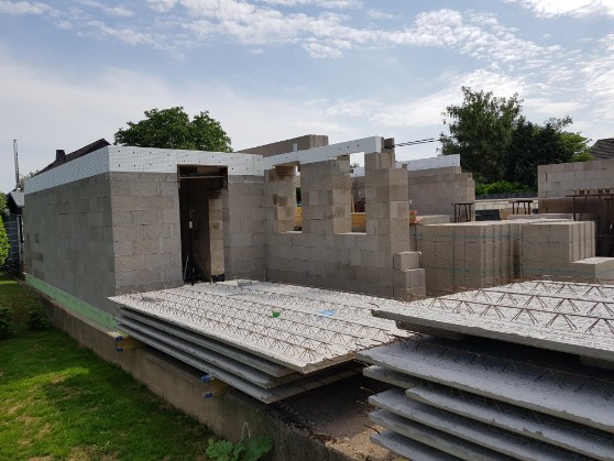 Bungalow mit angrenzender Garage in Dom Esch, Fundamente mit Lohr-Fundamentschalung, Außenwände aus 42,5cm Bims-Thermsteinen, Innenwände aus 24cm und 11,5cm Bims-Steinen, ABI-Elementdecke