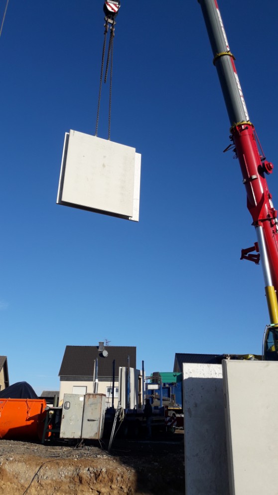4-Familienhaus in Palmersheim, Keller aus Beton-Fertikteilen, Außenwände aus 36,5cm Porenbeton-XL Elementen Tragende Innenwände aus 24cm KS-XL Elementen und geschalten Ortbetonwänden, ABI-Elementdecken